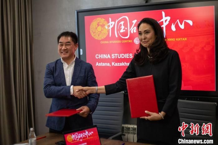 當(dāng)?shù)貢r間24日,哈薩克斯坦阿斯塔納,哈薩克斯坦中國研究中心主任古麗娜爾與上海交通大學(xué)醫(yī)學(xué)院院長辦公室副主任童天朗簽署合作備忘錄?! ≈鬓k方供圖