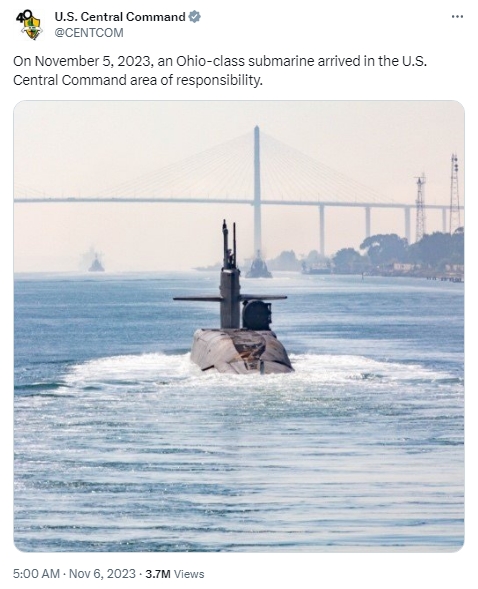 據(jù)報(bào)道,當(dāng)天,美國(guó)中央司令部在社交媒體上發(fā)帖稱(chēng),“11月5日,一艘‘俄亥俄’級(jí)戰(zhàn)略潛艇抵達(dá)中東地區(qū)。”