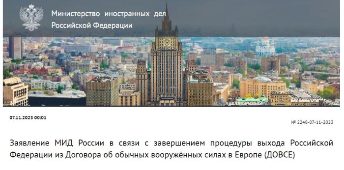 當(dāng)?shù)貢r(shí)間11月7日,俄羅斯外交部發(fā)布關(guān)于俄羅斯完成退出《歐洲常規(guī)武裝力量條約》程序的聲明。圖片來(lái)源:俄羅斯外交部網(wǎng)站