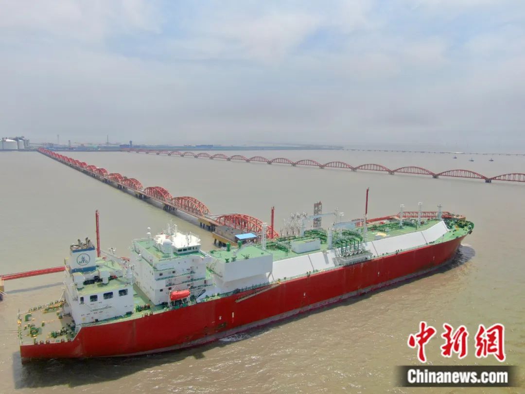 2021年5月,在江蘇省如東縣洋口港中石油江蘇LNG接收站碼頭,來自阿爾及利亞的“科洛尼斯”LNG船正在接卸進(jìn)口天然氣。許叢軍 攝
