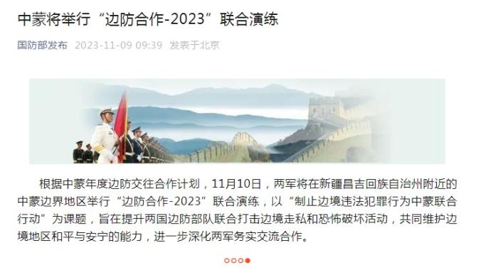 中新網(wǎng)11月9日電 據(jù)國防部發(fā)布微信公眾號消息,根據(jù)中蒙年度邊防交往合作計劃,11月10日,兩軍將在新疆昌吉回族自治州附近的中蒙邊界地區(qū)舉行“邊防合作-2023”聯(lián)合演練,以“制止邊境違法犯罪行為中蒙聯(lián)合行動”為課題,旨在提升兩國邊防部隊(duì)聯(lián)合打擊邊境走私和恐怖破壞活動,共同維護(hù)邊境地區(qū)和平與安寧的能力,進(jìn)一步深化兩軍務(wù)實(shí)交流合作。