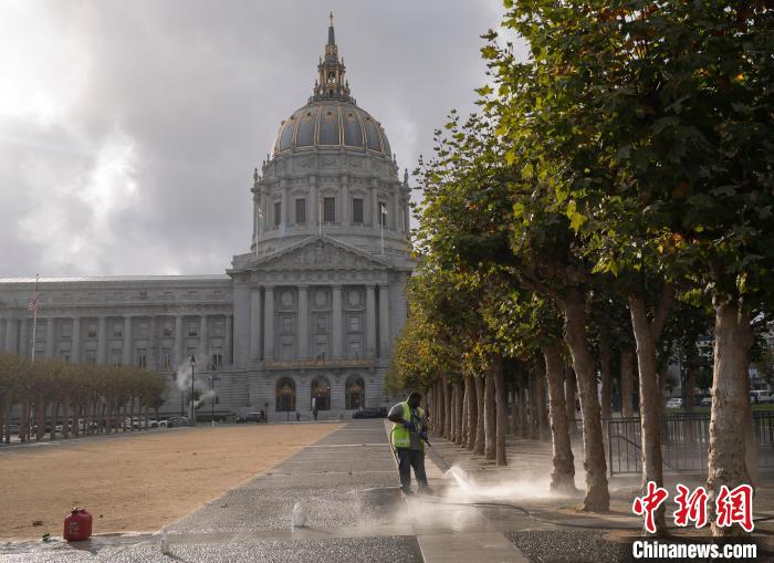 當(dāng)?shù)貢r(shí)間11月6日,工作人員在舊金山市政廳前的市政中心廣場(chǎng)清潔地面?!≈行律缬浾? 劉關(guān)關(guān) 攝