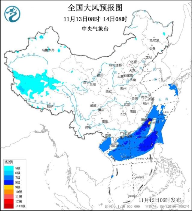 12日08時(shí)至13日08時(shí),新疆沿天山地區(qū)和南疆盆地、青海東部和西部、福建東南部沿海地區(qū)、臺灣島等地部分地區(qū)將有5~6級、陣風(fēng)7~8級的大風(fēng);東海大部海域、臺灣海峽、臺灣以東洋面、巴士海峽、南海北部和中部海域、北部灣將有7~8級、陣風(fēng)9級的大風(fēng),其中臺灣海峽部分海域風(fēng)力可達(dá)9級、陣風(fēng)10級。13日08時(shí)至14日08時(shí),新疆南疆盆地、西藏北部和西部、青海西部、福建東南部沿海地區(qū)、臺灣島等地將有5~6級、陣風(fēng)7~8級的大風(fēng);東海南部海域、臺灣海峽、臺灣以東洋面、巴士海峽、南海北部和中部海域、北部灣、瓊州海峽將有7~8級、陣風(fēng)9級的大風(fēng),其中臺灣海峽部分海域風(fēng)力可達(dá)9級、陣風(fēng)10級。中央氣象臺11月12日06時(shí)繼續(xù)發(fā)布大風(fēng)藍(lán)色預(yù)警。