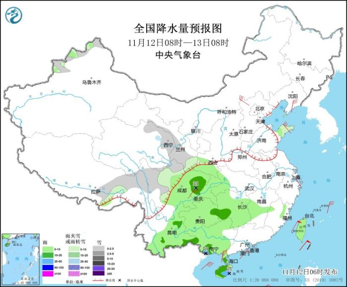 11月12日08時(shí)至13日08時(shí),新疆北疆北部和伊犁河谷、西藏東部、青海南部和東部、川西高原北部、甘肅中南部等地部分地區(qū)有小雪或雨夾雪。四川盆地、貴州東部、湖南西部、云南南部和東部、廣西南部、雷州半島、海南島等地部分地區(qū)有中到大雨,其中,廣西南部、海南島東部局地有暴雨(50~75毫米)。內(nèi)蒙古中東部、遼東半島、河北北部、山東半島、四川盆地、浙江東部、雷州半島等地部分地區(qū)有5~6級風(fēng)。東海大部、臺灣海峽、臺灣以東洋面、巴士海峽、南海北部和中部、北部灣將有7~8級、陣風(fēng)9級的大風(fēng)。