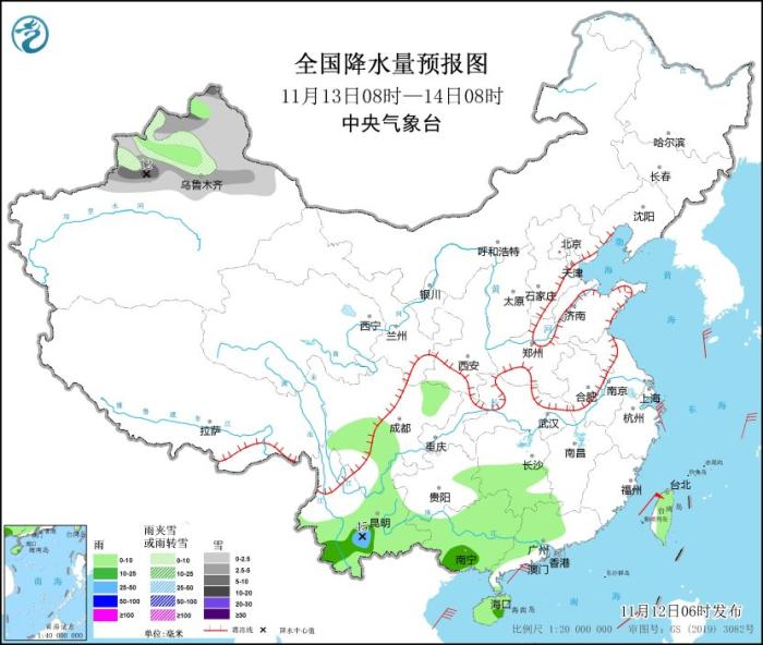 11月13日08時(shí)至14日08時(shí),新疆北部等地部分地區(qū)有小到中雪或雨夾雪,局地大到暴雪(10~12毫米)。湖南南部、四川盆地、貴州南部和東部、云南大部、廣西、廣東北部、海南島、臺灣島等地部分地區(qū)有小到中雨,其中,云南中部局地有大雨(25~45毫米)。東海南部、臺灣海峽、臺灣以東洋面、巴士海峽、南海北部和中部、北部灣、瓊州海峽將有7~8級、陣風(fēng)9級的大風(fēng)。