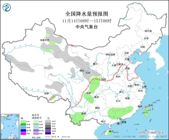 11月14日08時(shí)至15日08時(shí),新疆沿天山地區(qū)和南疆西南部、西藏北部和東部、青海北部和東部、甘肅大部、寧夏南部等地部分地區(qū)有小雪或雨夾雪。甘肅南部、陜西南部、湖南南部、江西南部、福建西南部、四川盆地、云南中部和西南部、廣西東部、廣東中北部、海南島東部、臺灣島等地部分地區(qū)有小雨。內(nèi)蒙古西北部、青海西部等地部分地區(qū)有5~7級風(fēng)。臺灣海峽、北部灣、瓊州海峽將有7~8級、陣風(fēng)9級的大風(fēng)。