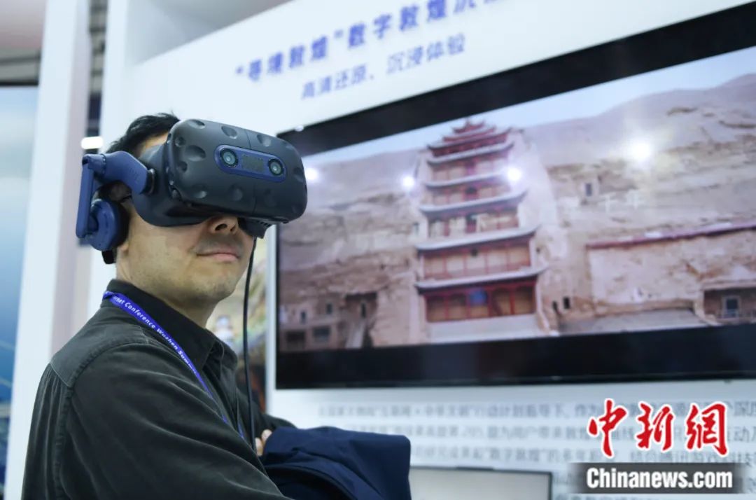 2023年世界互聯(lián)網(wǎng)大會(huì)“互聯(lián)網(wǎng)之光”博覽會(huì)上,一位參觀者使用VR眼鏡體驗(yàn)數(shù)字敦煌。王剛 攝