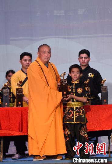當(dāng)?shù)貢r(shí)間11月12日下午,由中國嵩山少林寺主辦的“不朽少林”少林功夫公演在已有逾百年歷史的美國洛杉磯Million Dollar劇院舉行。圖為嵩山少林寺方丈釋永信向“北美洲少林考功大賽”獲獎(jiǎng)?wù)哳C獎(jiǎng)?!≈行律缬浾? 張朔 攝