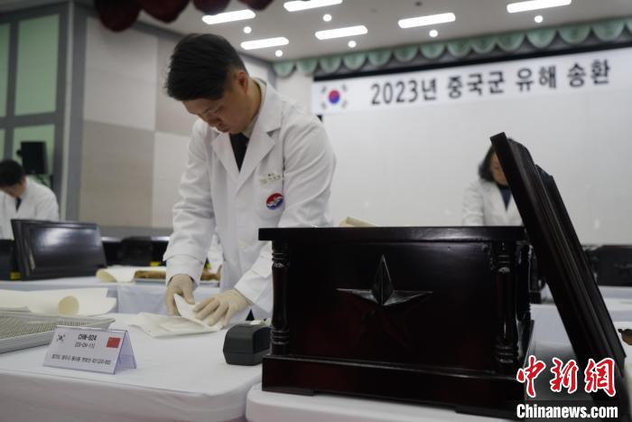 當(dāng)?shù)貢r間11月22日上午,第十批在韓中國人民志愿軍烈士遺骸裝殮儀式在韓國舉行。圖為韓方工作人員對志愿軍烈士遺骸進(jìn)行裝殮。中新社記者 劉旭 攝
