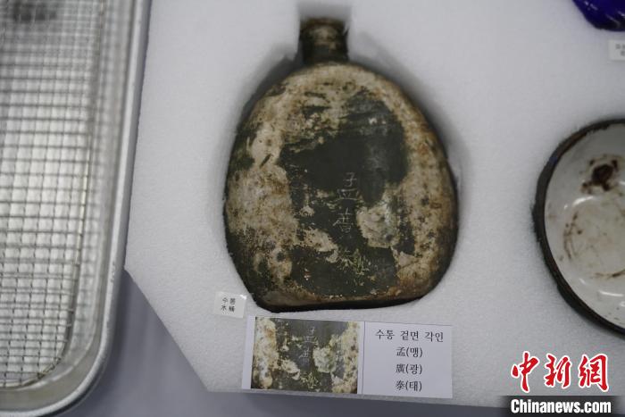 當(dāng)?shù)貢r間11月22日上午,第十批在韓中國人民志愿軍烈士遺骸裝殮儀式在韓國舉行。圖為裝殮儀式現(xiàn)場拍攝的寫有“孟廣泰”名字的水壺。中新社記者 劉旭 攝