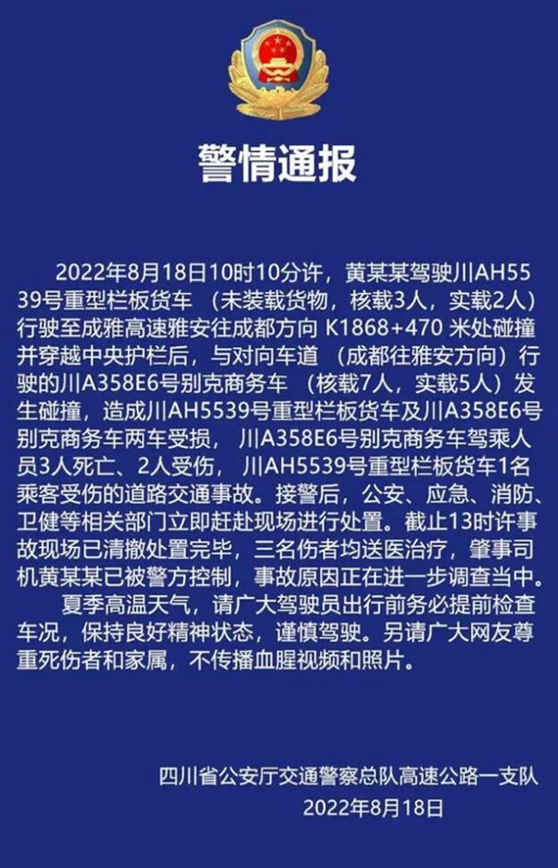2022年8月18日10時(shí)10分許,G5京昆高速公路成雅段K1868公里+150米路段(成都市蒲江縣境內(nèi))發(fā)生川 AH55**貨車沖斷中央護(hù)欄與對(duì)向正常行駛的川A35***小客車發(fā)生碰撞,造成小客車內(nèi)3人當(dāng)場(chǎng)死亡,小客車內(nèi)2人和大貨車內(nèi)1人受傷、2車及高速公路路產(chǎn)受損的道路交通事故,直接經(jīng)濟(jì)損失約350萬(wàn)元。