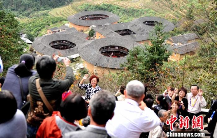 2011年,來自世界五大洲三十多個(gè)國家和地區(qū)的海內(nèi)外華人作家、學(xué)者,參加完在廣州舉辦的世界華文文學(xué)研討會(huì)后,來到福建漳州,參觀南靖土樓群。王東明 攝