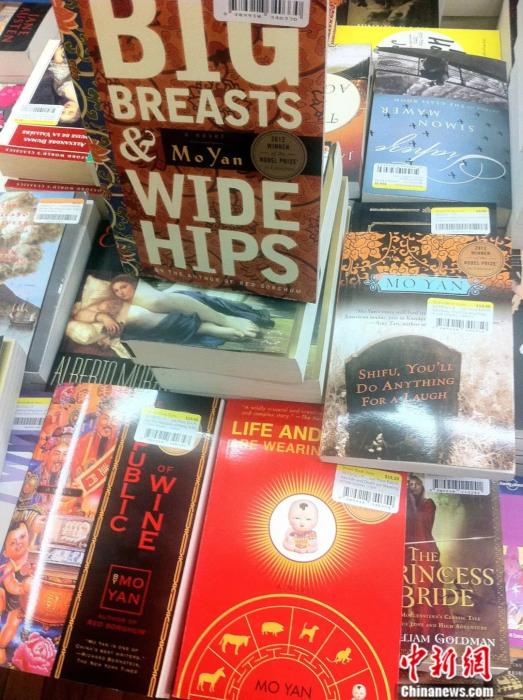 2012年10月21日,莫言的《豐乳肥臀》《酒國》等多部作品英文版正在紐約一家書店上架出售,每本書的封面都印有“2012年諾貝爾文學(xué)獎(jiǎng)獲得者”字樣。李洋 攝