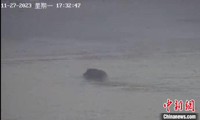 27日傍晚,南京海事局交管中心值班人員在通過長江三橋上的攝像頭例行巡查時,意外地發(fā)現(xiàn)江面上有一頭野豬在游泳。江蘇海事局 供圖