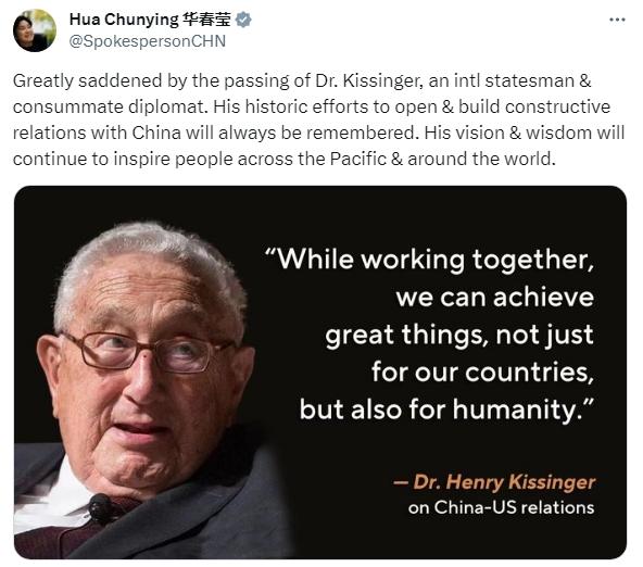 華春瑩寫道,“我對基辛格博士的逝世深感悲痛,他是一位國際政治家和杰出的外交家。我們將永遠銘記他為開拓和建立同中國的建設性關(guān)系所作的歷史性努力。他的遠見和智慧將繼續(xù)激勵太平洋地區(qū)乃至世界各地的人們。”