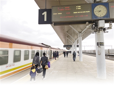 由中國(guó)路橋工程有限責(zé)任公司承建的蒙內(nèi)鐵路是肯尼亞獨(dú)立以來(lái)建設(shè)的首條鐵路,也是一條采用中國(guó)標(biāo)準(zhǔn)、中國(guó)技術(shù)、中國(guó)裝備建造的現(xiàn)代化鐵路,被譽(yù)為中國(guó)和肯尼亞共建“一帶一路”標(biāo)志性工程。圖為蒙內(nèi)鐵路列車(chē)??吭趦?nèi)羅畢站。