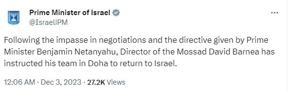 聲明稱,“談判陷入僵局后,經(jīng)(以色列)總理內(nèi)塔尼亞胡指示,(以色列情報機構(gòu))摩薩德負(fù)責(zé)人大衛(wèi)·巴尼亞命令其在多哈的團隊返回以色列?!?/p>