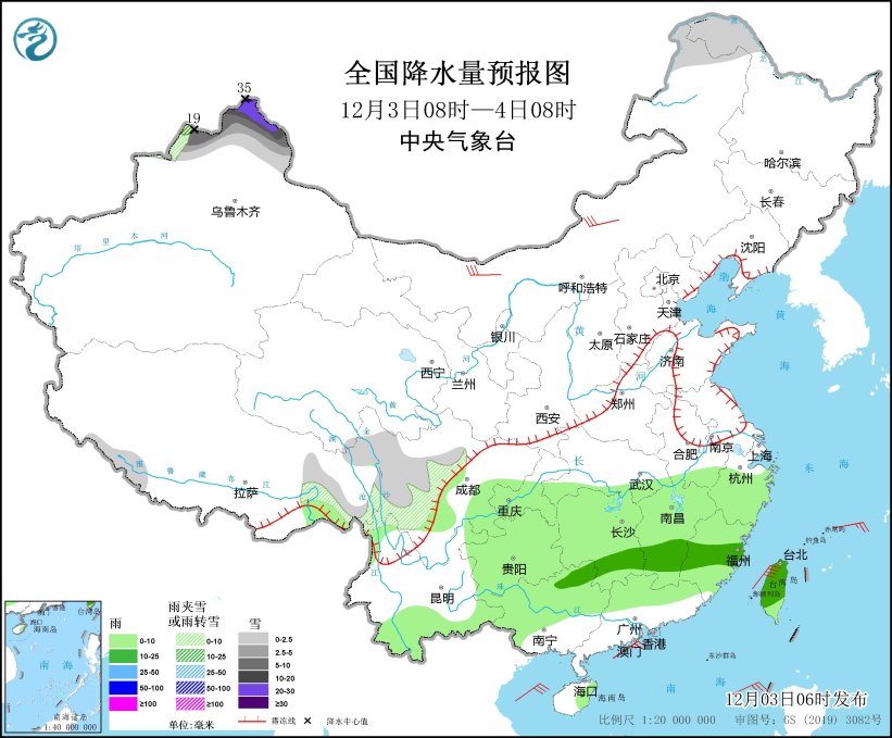 12月3日08時至4日08時,新疆北部、內(nèi)蒙古東北部、黑龍江西北部、西藏西南部和東部、川西高原等地部分地區(qū)有小到中雪或雨夾雪,其中,新疆北疆北部等地部分地區(qū)有大到暴雪,局地大暴雪或特大暴雪(30~35毫米)。江南、西南地區(qū)東部和南部、華南北部和西部、臺灣島等地部分地區(qū)有小雨,其中,湖南南部、江西中南部、福建中部、廣西東北部、臺灣島中北部等地部分地區(qū)有中雨。內(nèi)蒙古中西部等地部分地區(qū)有4~6級風(fēng)。
