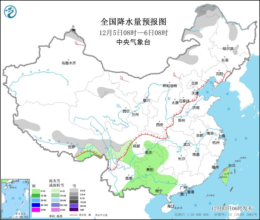 12月5日08時至6日08時,新疆北疆北部、內(nèi)蒙古中東部、黑龍江西北部、西藏東部和北部、甘肅河西、川西高原等地部分地區(qū)有小雪或雨夾雪,其中,內(nèi)蒙古東北部、黑龍江西北部、新疆北疆北部等地部分地區(qū)有中到大雪(5~8毫米)。西南地區(qū)東部、云南東部、廣西大部、臺灣島等地部分地區(qū)有小雨。新疆北部、內(nèi)蒙古中西部等地部分地區(qū)有4~6級風(fēng)。