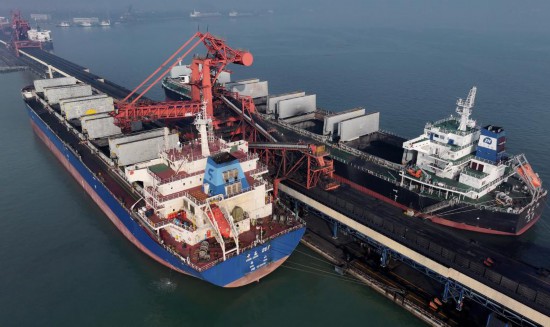 12月5日,兩艘輪船靠泊在唐山港曹妃甸港區(qū)國投曹妃甸港口有限公司煤炭碼頭裝貨(無人機照片)。新華社記者楊世堯攝