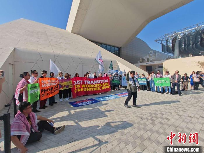 12月9日,阿聯(lián)酋迪拜,抗議者在聯(lián)合國(guó)氣候變化迪拜大會(huì)藍(lán)區(qū)會(huì)場(chǎng)集會(huì)并呼吁公正轉(zhuǎn)型。 中新社記者 龐無(wú)忌 攝