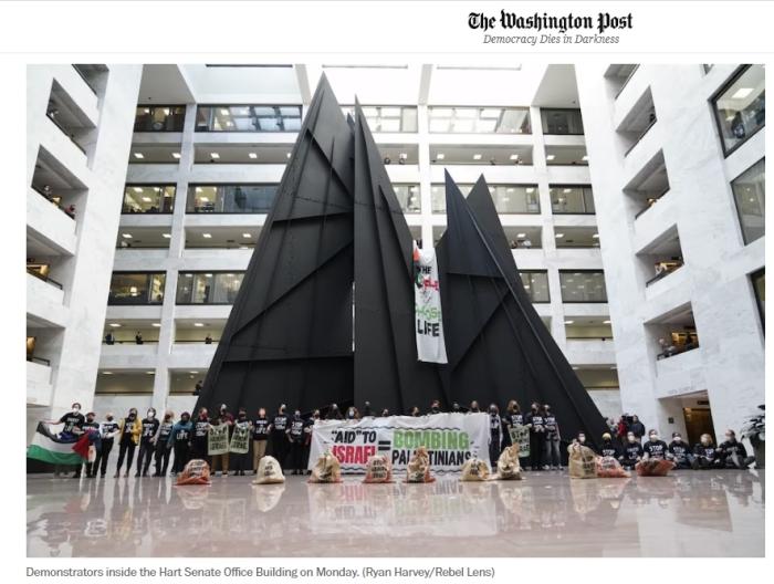 報道稱,抗議者身穿寫有“立即停止(援助)武器”字樣的黑色T恤,高喊“立即停火!立即?;?!”。他們還舉著寫有“援助以色列=轟炸巴勒斯坦人”的條幅。