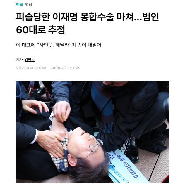 據(jù)報道,李在明2日在釜山出席活動時遇襲,頸部左側(cè)有約1厘米裂傷,在現(xiàn)場接受緊急止血,隨后送醫(yī)治療。當?shù)貢r間11點14分左右,李在明接受了縫合手術。