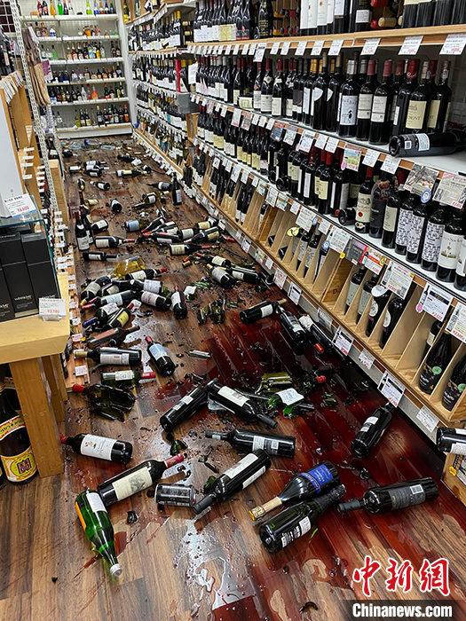 圖為1月1日,石川縣金澤市一家超市內(nèi)酒類(lèi)貨架上的商品因地震散落、破碎。 中新社發(fā) 鐘欣 攝