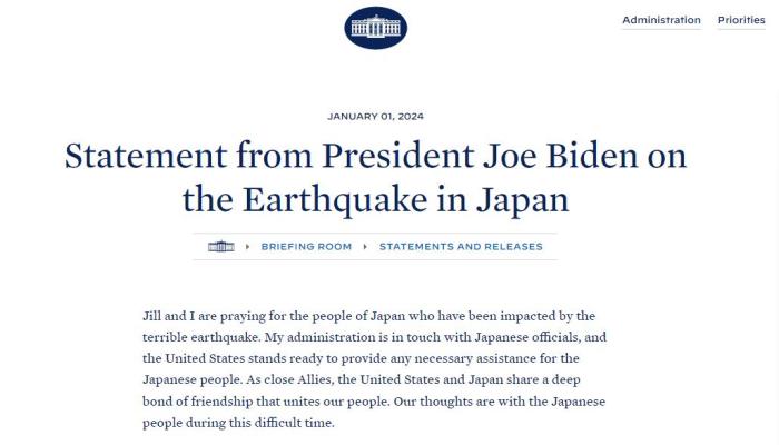聲明稱,美國總統(tǒng)拜登和第一夫人吉爾“正在為遭受可怕地震影響的日本人民祈禱。拜登政府正與日本官員保持聯(lián)系,美國隨時準(zhǔn)備為日本民眾提供任何必要的援助。”