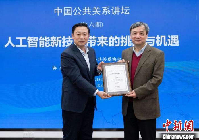 1月8日,中國公共關(guān)系講壇在北京舉行。圖為講壇結(jié)束后,中國公共關(guān)系協(xié)會會長郭衛(wèi)民(左)向演講嘉賓、清華大學(xué)人工智能研究院常務(wù)副院長孫茂松頒發(fā)榮譽證書?! ≈袊碴P(guān)系協(xié)會供圖。