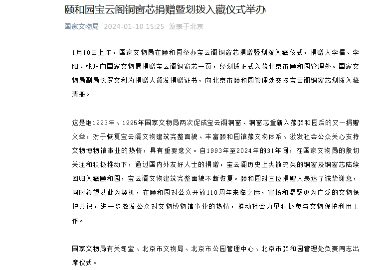 這是繼1993年、1995年國家文物局兩次促成寶云閣銅窗、銅窗芯重新入藏頤和園后的又一捐贈義舉,對于恢復(fù)寶云閣文物建筑完整面貌、豐富頤和園館藏文物體系、激發(fā)社會公眾關(guān)心支持文物博物館事業(yè)的熱情,具有重要意義。自1993年至2024年的31年間,在國家文物局的殷切關(guān)注和積極推動下,通過國內(nèi)外友好人士的捐贈,寶云閣歷史上失散流失的銅窗及銅窗芯陸續(xù)回歸入藏頤和園,寶云閣文物建筑完整面貌不斷恢復(fù)。頤和園對三位捐贈人表達(dá)了誠摯謝意,同時希望以此為契機(jī),在頤和園對公眾開放110周年來臨之際,宣揚(yáng)和凝聚更為廣泛的文物保護(hù)共識,進(jìn)一步激發(fā)公眾對文物博物館事業(yè)的熱情,推動社會力量積極參與文物保護(hù)利用工作。