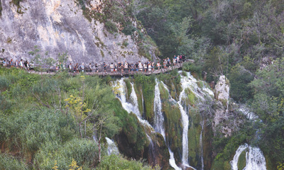 克羅地亞普利特維采湖國家公園是中國九寨溝國家級自然保護(hù)區(qū)的“姐妹”自然遺產(chǎn)地。兩者同屬喀斯特地貌,是世界非常罕見的冷水鈣華景觀。中國科學(xué)院成都生物研究所與克羅地亞薩格勒布大學(xué)合作成立“中國—克羅地亞生物多樣性和生態(tài)系統(tǒng)服務(wù)‘一帶一路’聯(lián)合實(shí)驗(yàn)室”,為兩國世界自然遺產(chǎn)地生態(tài)保育作出重要貢獻(xiàn)。圖為當(dāng)?shù)赜慰驮谄绽鼐S采湖國家公園參觀。