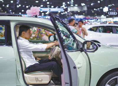 在2023年舉辦的第四十屆泰國國際汽車博覽會上,中國品牌電動汽車訂單量在所有參展品牌中名列前茅。在中國品牌的強(qiáng)勁拉動下,參展電動汽車訂單量首次超越燃油汽車訂單量。圖為當(dāng)?shù)貐⒂^者在車博會上試駕中國品牌電動汽車。