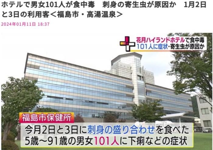 報道稱,中毒者年齡下至5歲,上至91歲。保健所在調查中發(fā)現(xiàn)該酒店提供的魚類刺身上檢測出寄生蟲,并認為這就是導致此次食物中毒的原因。