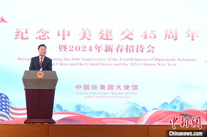 當(dāng)?shù)貢r(shí)間1月16日,中國(guó)駐美國(guó)使館舉辦紀(jì)念中美建交45周年暨新春招待會(huì)。圖為中國(guó)駐美大使謝鋒致辭。中新社記者 陳孟統(tǒng) 攝