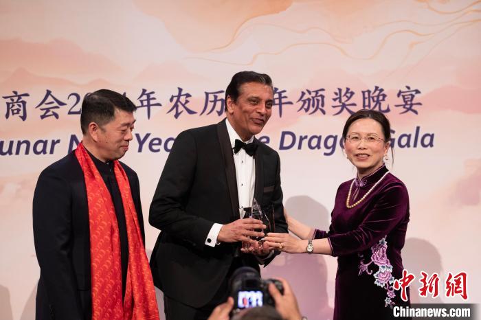 當?shù)貢r間1月18日,美國中國總商會(CGCC)在紐約舉行2024年農(nóng)歷龍年頒獎晚宴。圖為中國駐美國大使館公使徐學淵(右)為聯(lián)邦快遞總裁兼首席執(zhí)行官拉杰·蘇巴馬廉(中)頒發(fā)“國際領(lǐng)導(dǎo)力獎”?!≈行律缬浾?廖攀 攝