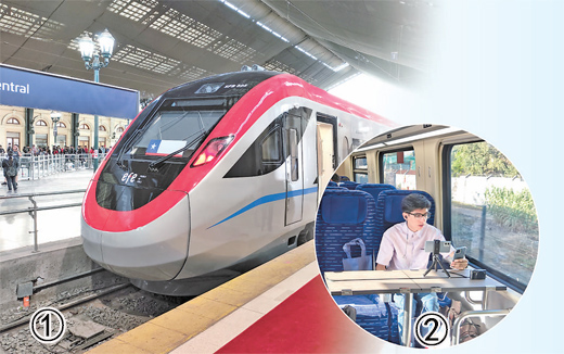圖②:新列車(chē)上線儀式當(dāng)天,一名旅客在車(chē)廂中直播。