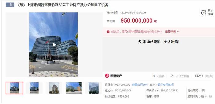 本次拍賣標(biāo)的評(píng)估總價(jià)約為13.5億元,以9.5億元的價(jià)格起拍,約為評(píng)估總價(jià)的7折。拍賣于1月23日上午10時(shí)至1月24日上午10時(shí)止,雖然這場拍賣有超過1.3萬人圍觀,但最終無人出價(jià),以流拍結(jié)束。