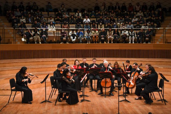 這是2023年11月16日拍攝的音樂會現(xiàn)場。當(dāng)日,“費城之約”——費城交響樂團與蘇州交響樂團室內(nèi)樂音樂會在江蘇蘇州舉行。新華社記者 李博 攝