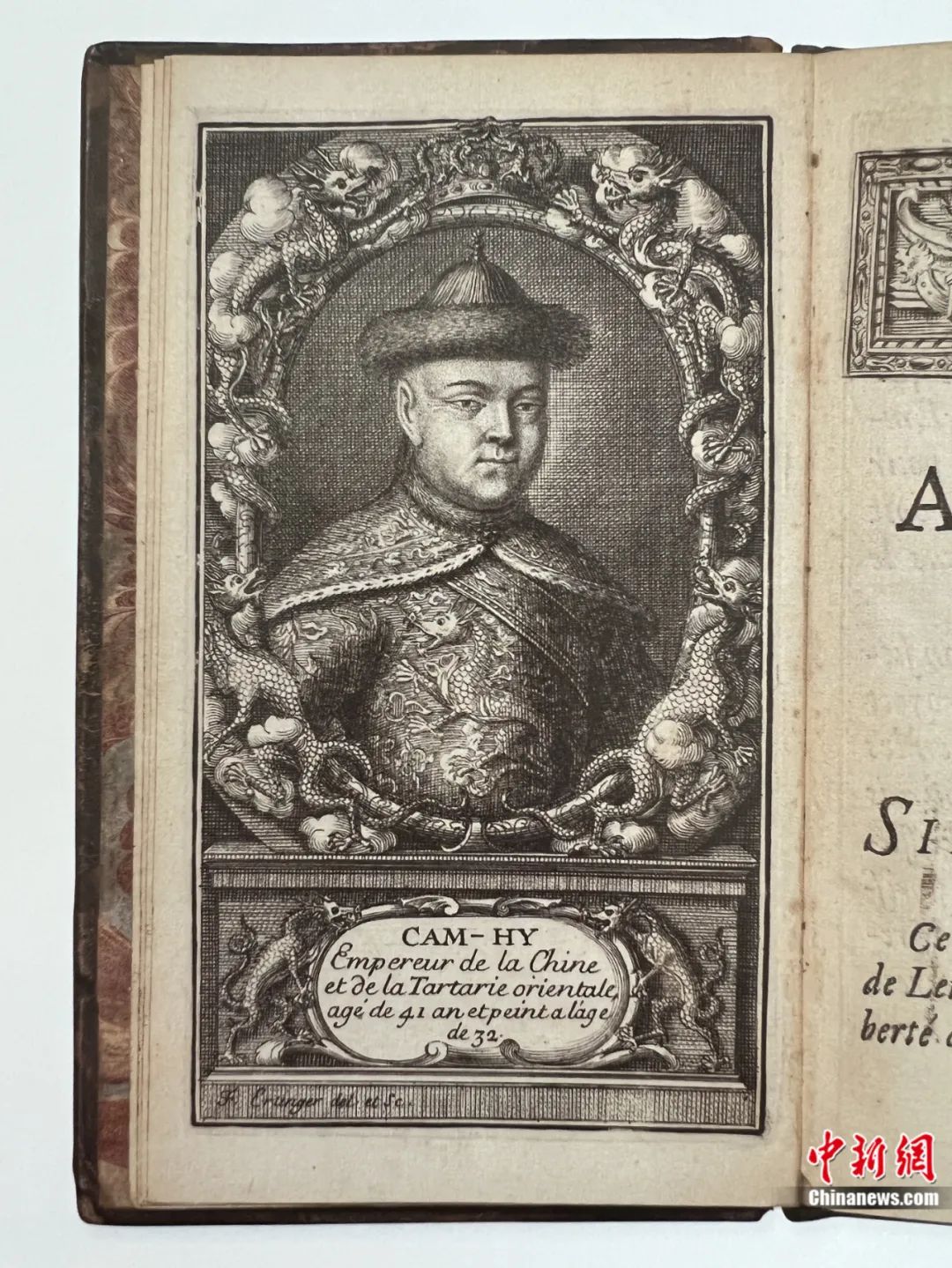 法國(guó)傳教士李明(1655-1728),受法國(guó)國(guó)王路易十四派遣來華傳教,在中國(guó)停留數(shù)年后返回歐洲。他在巴黎出版的《中國(guó)近事報(bào)道》扉頁有一幅康熙皇帝的銅版畫像,可能是歐洲最早公開出版的康熙皇帝畫像。畫像中康熙皇帝衣服的胸部繪著一條行龍,同時(shí)畫像四周邊飾以及下面的圖題兩側(cè)均裝飾中國(guó)龍的形象。龍的圖案顯然是用來表明畫像中人物的皇帝身份。