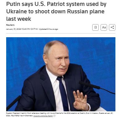 中新網(wǎng)2月1日電 據(jù)路透社報道,俄羅斯總統(tǒng)普京當?shù)貢r間1月31日表示,俄方確認此前載有被俘烏克蘭軍事人員的俄伊爾-76軍用運輸機是被美制“愛國者”導(dǎo)彈系統(tǒng)擊落。