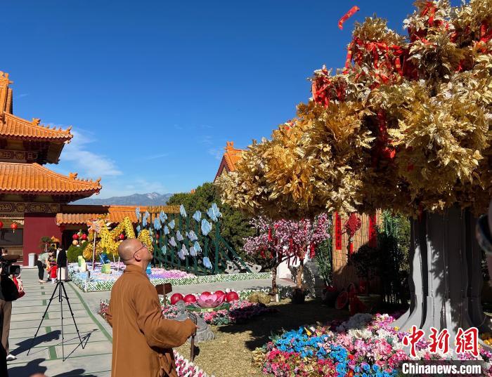 記者當日在西來寺看到,大雄寶殿前,靈動的“歡喜龍”主燈已搭建完成。平安燈會以“云水自在,祥和歡喜”為設(shè)計主題,祝福人們懷著喜悅的心情迎接新年。春節(jié)期間,寺院成佛大道兩旁還有龍?zhí)熳o佑、五福臨門行三好、百花齊放迎新春、諸事圓滿祈愿樹等景觀。