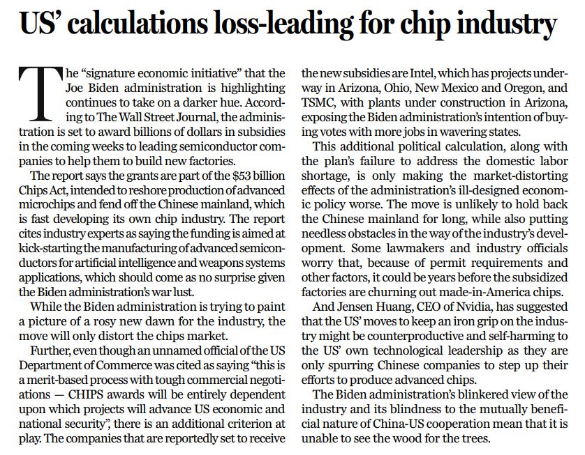 美國失策的經(jīng)濟(jì)政策本已造成市場扭曲,疊加出于政治意圖的算計(jì),以及補(bǔ)貼也無法解決的勞動(dòng)力短缺問題,這一切只會讓扭曲態(tài)勢進(jìn)一步惡化。此舉不太可能長期遏制中國大陸,但卻給行業(yè)發(fā)展帶來種種不必要的障礙。美國部分國會議員及企業(yè)高管擔(dān)心,受到許可要求及其他因素影響,享受補(bǔ)貼的企業(yè)可能要花費(fèi)很多年才能生產(chǎn)出美國制造的芯片。