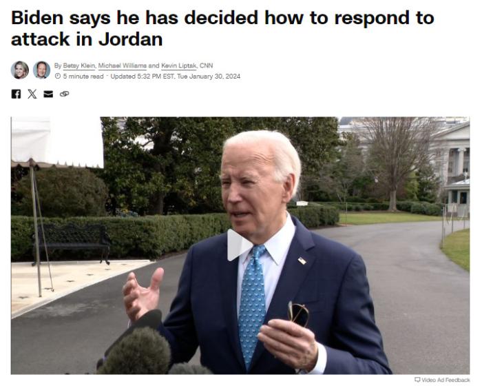 中新網1月31日電 據美國有線電視新聞網(CNN)報道,當地時間30日,美國總統(tǒng)拜登表示,他已就美國如何應對約旦美軍基地遇襲事件做出決定。早些時候,該襲擊造成3名美軍士兵死亡、數十人受傷。