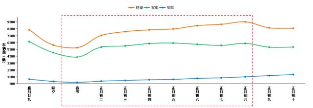 預(yù)計(jì)春節(jié)期間全國高速公路客車日均流量約4890萬輛,小客車占客車比例預(yù)計(jì)達(dá)99%以上。貨車流量在春節(jié)節(jié)前逐日下降,在正月初一達(dá)到最低值,春節(jié)假期之后逐漸恢復(fù)到日常水平,但貨車流量同比去年預(yù)計(jì)有所增長。