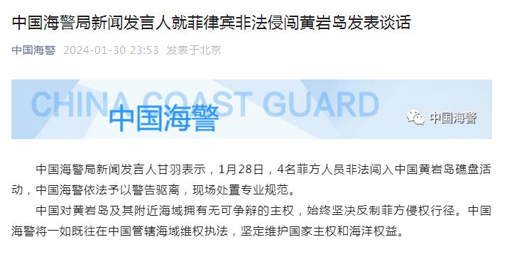 中新網(wǎng)1月31日電 據(jù)中國(guó)海警微信公眾號(hào)30日消息,中國(guó)海警局新聞發(fā)言人甘羽表示,1月28日,4名菲方人員非法闖入中國(guó)黃巖島礁盤活動(dòng),中國(guó)海警依法予以警告驅(qū)離,現(xiàn)場(chǎng)處置專業(yè)規(guī)范。