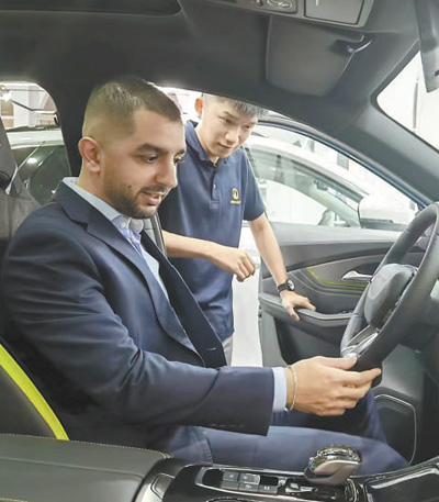 埃及首都開羅,熱鬧繁華的穆罕迪森區(qū),阿拉伯國(guó)家聯(lián)盟大街上車水馬龍。走進(jìn)一家汽車展銷店,一眾知名品牌汽車中,來自中國(guó)的新能源汽車格外引人注目。
