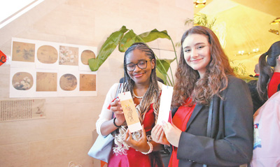 圖為在文化體驗(yàn)展臺(tái),兩名美國(guó)學(xué)生展示自己用毛筆繪制的書(shū)簽。