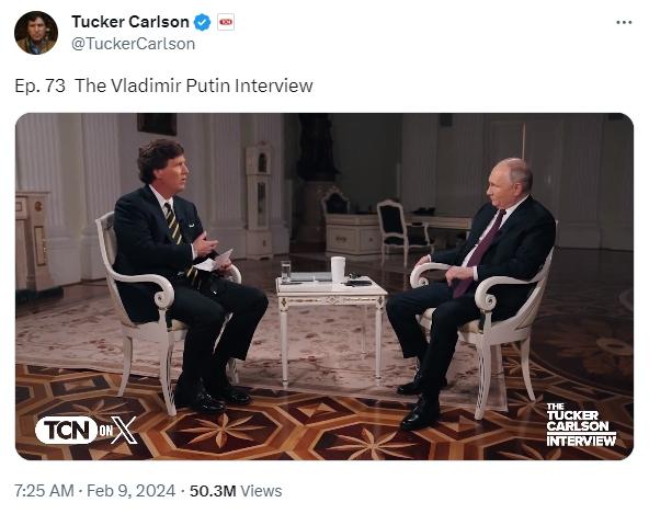 上線前,這場(chǎng)采訪就在世界范圍內(nèi)引發(fā)關(guān)注。有媒體稱,這次采訪或?qū)⒊蔀?022年烏克蘭危機(jī)爆發(fā)后,美國(guó)媒體人對(duì)普京進(jìn)行的首個(gè)正式訪問。相關(guān)通告已在社交媒體上獲得了網(wǎng)友的上億次瀏覽量。