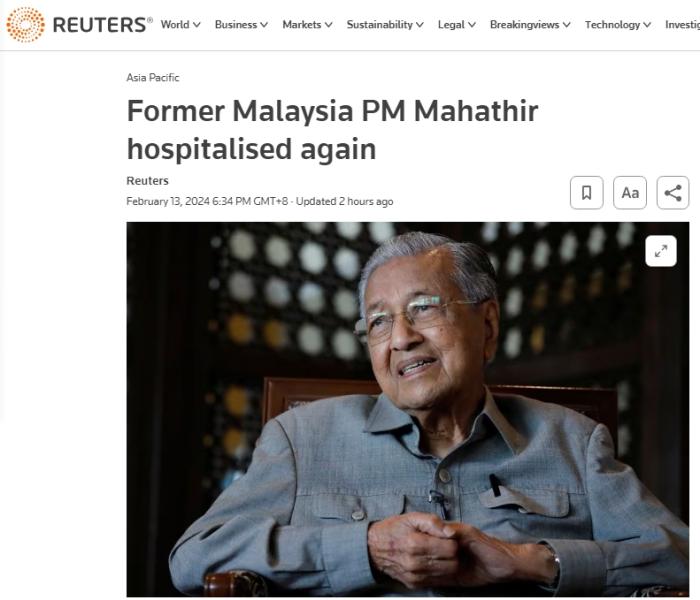 中新網(wǎng)2月13日電 據(jù)路透社和新加坡《聯(lián)合早報(bào)》報(bào)道,98歲的馬來西亞前總理馬哈蒂爾再次入院。其辦公室發(fā)言人13日證實(shí),馬哈蒂爾已經(jīng)入住國家心臟中心,但沒有透露入院原因。